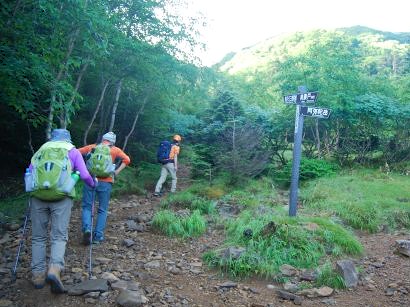 | 6:51 標高2,340m 行者小屋 | 7:00標高約2,410m文三郎尾根と阿弥陀岳分岐 |
